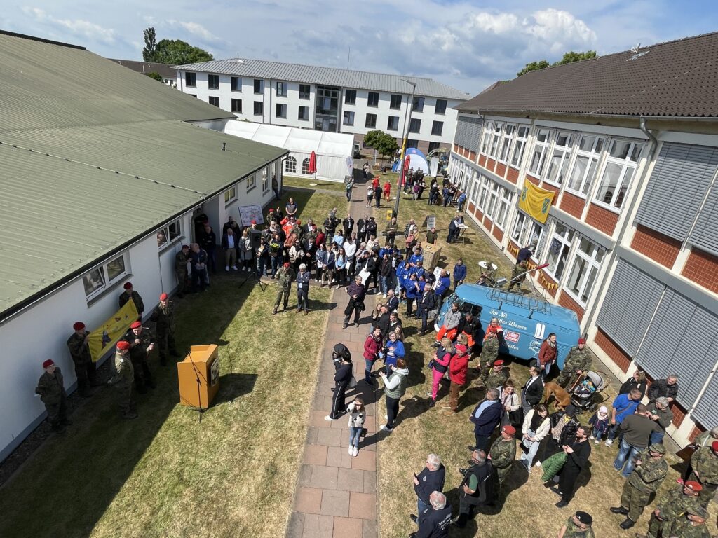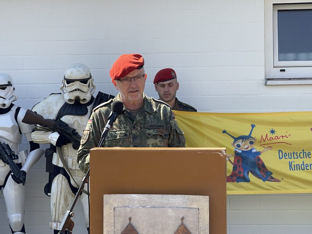„Dieser Moment – das werde ich nie vergessen“, sagte Duntemann, während seine Augen feucht wurden. Die feierliche Eröffnung am Samstag um 10:30 Uhr setzte dann einen weiteren emotionalen Höhepunkt. Zahlreiche Ehrengäste aus Politik und Bundeswehr fanden den Weg nach Holzminden, um Helmut Duntemann und seinem Team ihre Hochachtung auszudrücken. Der Kommandeur und Standortälteste Oberstleutnant Nico Meyer begrüßte die Gäste und verlas dabei die Grußworte des Bundesverteidigungsministers Boris Pistorius. Sabine Tippelt, als Vertreterin des Landkreises, sprach ebenso wie Dr. Franz Kohlhuber, Vorstandsvorsitzender der Deutschen KinderKrebshilfe und Oberst Stephan Podolski, stellvertretender Kommandeur der Panzerbrigade 21 – „Lipperland“.