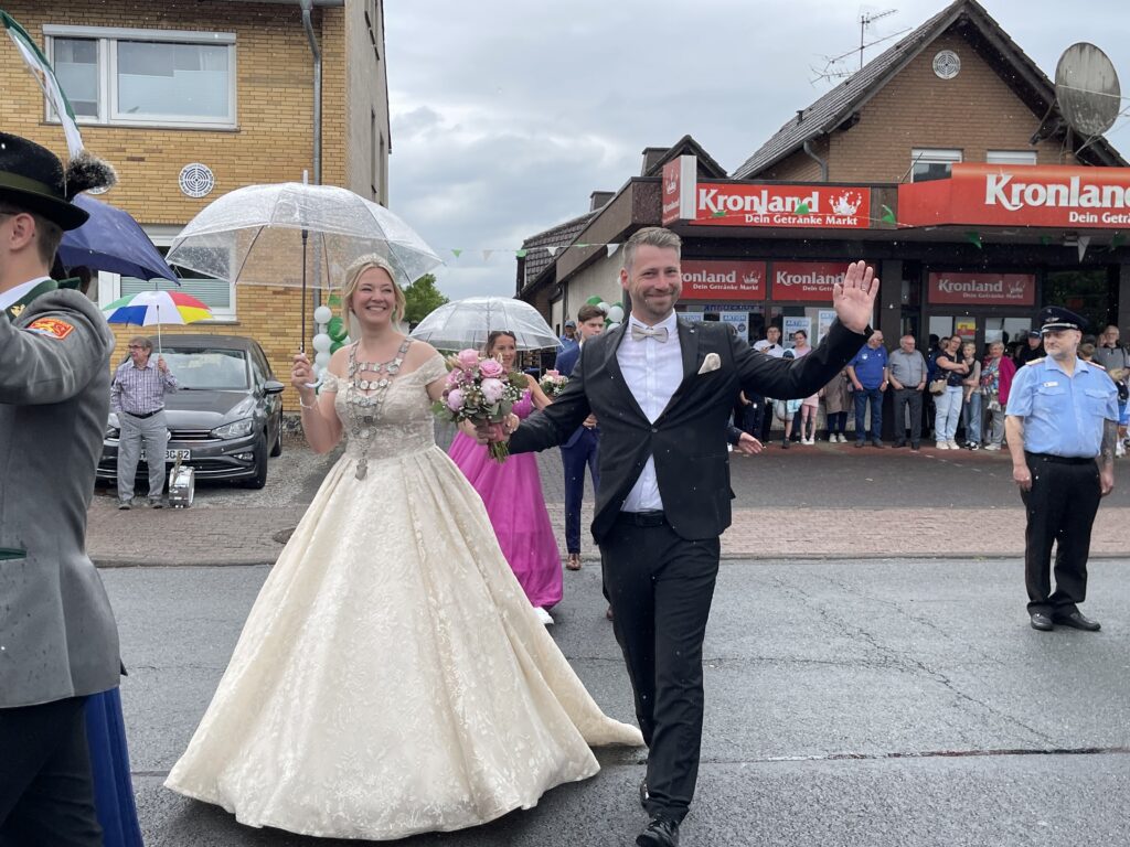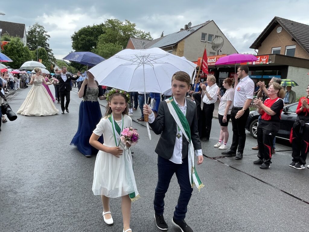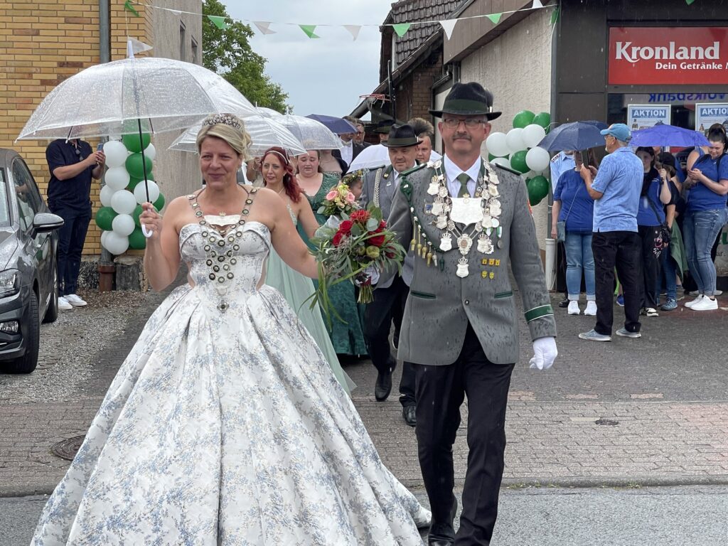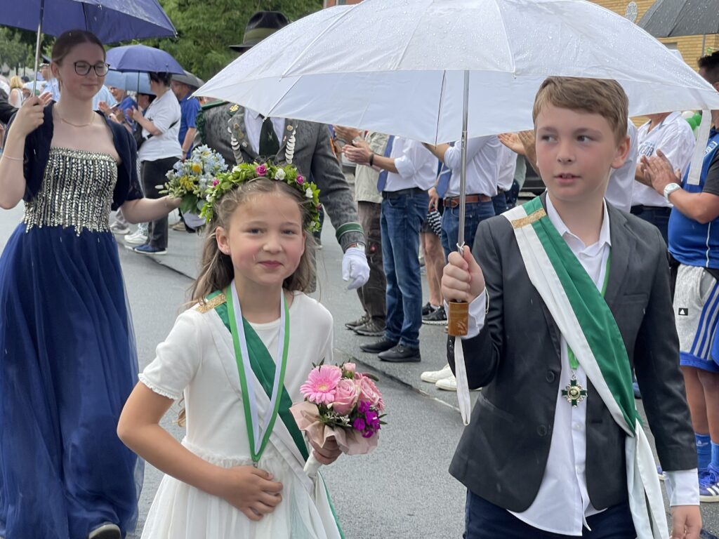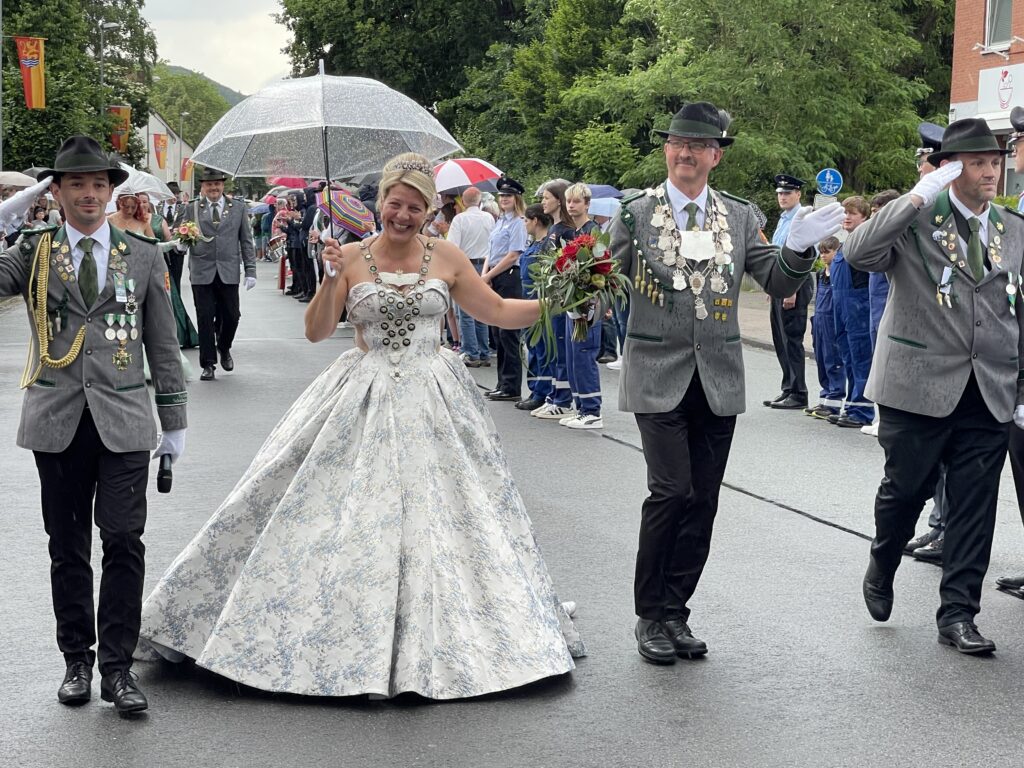 Einige Gäste suchten unter nahgelegenen Dächern Schutz vor dem Regen, verfolgten die Parade jedoch aufmerksam weiter. Neben dem feierlichen Abschreiten der restaurierten Fahne wurden auf der Bahnhofstraße auch die Majestäten offiziell vorgestellt: Schützenkönig Mario Bönning mit Schützenkönigin Melanie Garbe, Volkskönigin Marlena Heyer, begleitet von ihrem Ehemann, sowie das Kinderkönigspaar Timo Schäfer und Tilda Menke.