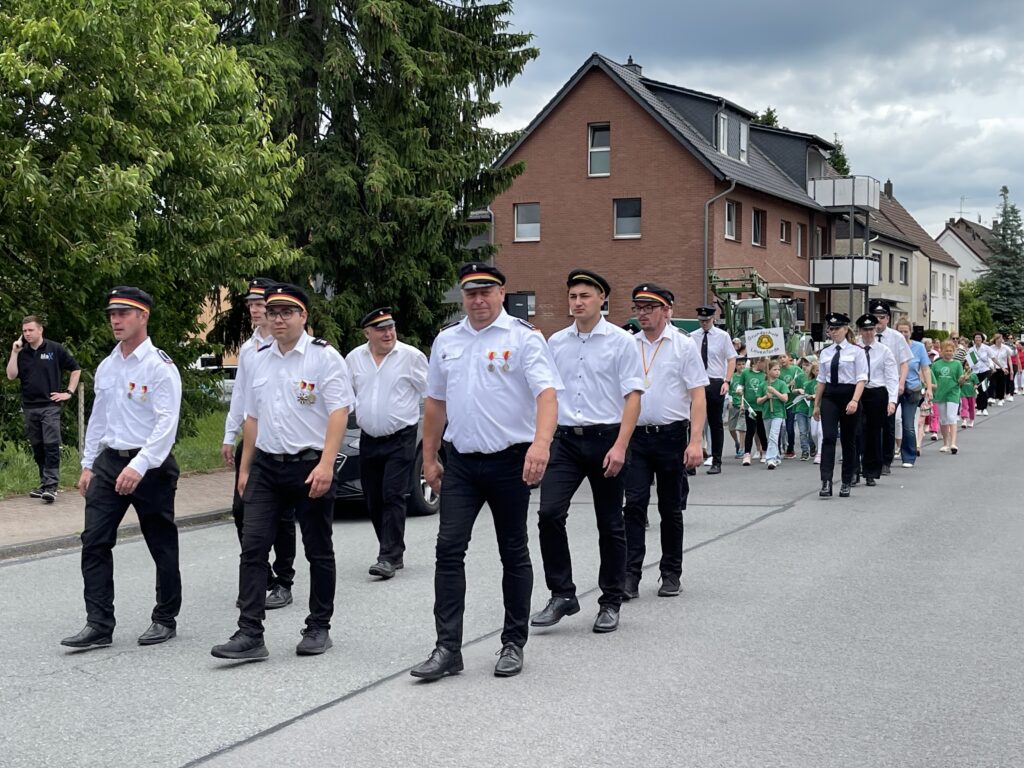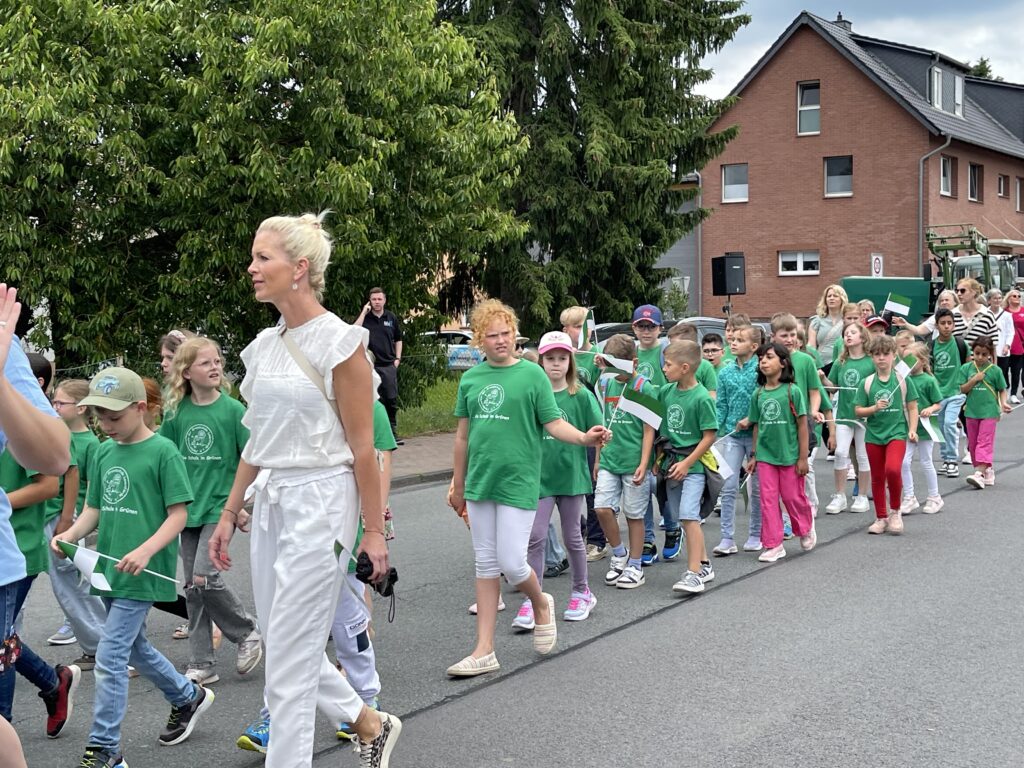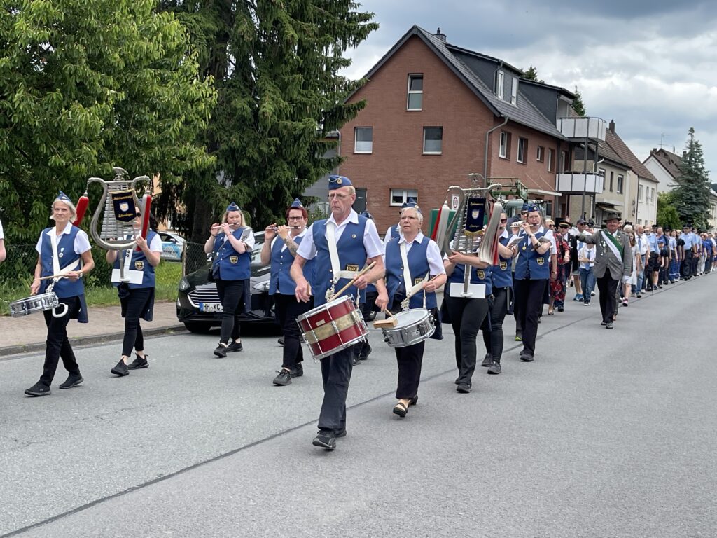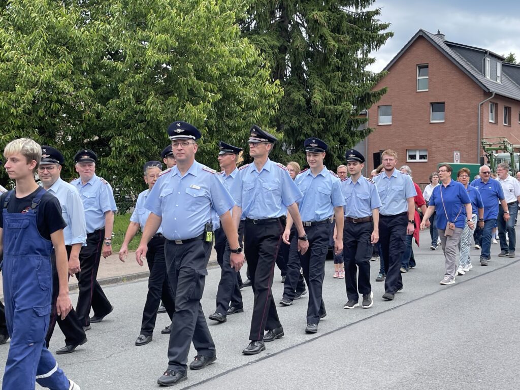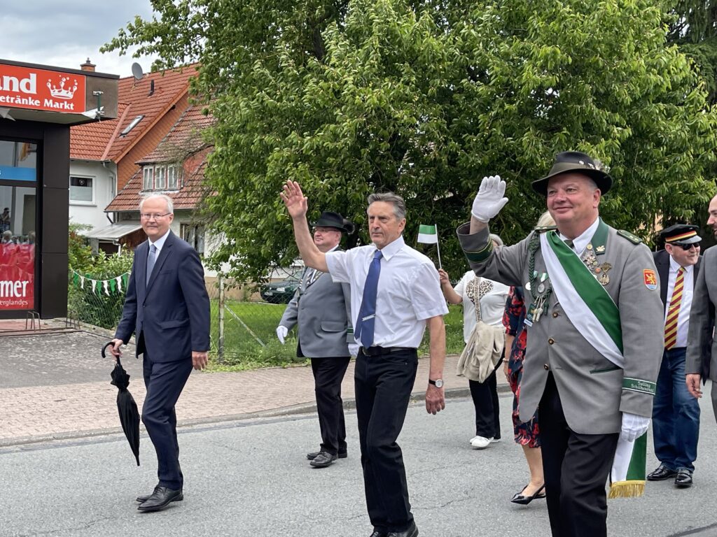 Höhepunkt des Festes war der große Umzug am Nachmittag. Rund hundert Schützen, Musikgruppen und befreundete Vereine zogen durch den Ort – gefeiert von mehreren hundert Zuschauerinnen und Zuschauern, die sich entlang der Straßen und besonders an der Bahnhofstraße versammelten. Pünktlich zum Beginn der Parade setzte leichter Regen ein, was der Stimmung aber keinen Abbruch tat. Petra Reinken, die die Zeremonie per Mikrofon kommentierte, stellte souverän über 20 teilnehmende Vereine vor.