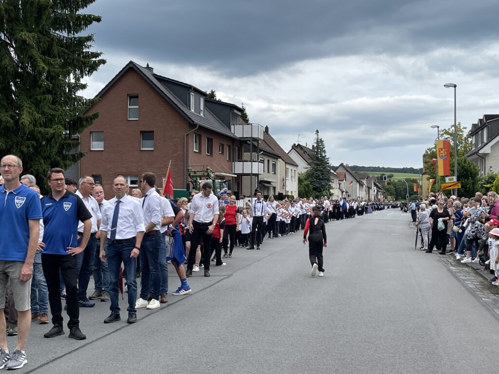 Der designierte Volkskönig Tino Wenkel konnte in diesem Jahr nicht am Fest teilnehmen. Zum Abschluss sorgten die Musikkapellen mit einem gemeinsamen Bühnenspiel für einen stimmungsvollen Ausklang, bevor ein DJ den musikalischen Schlusspunkt im Festzelt setzte. Vorsitzender Marcel Gerhards zeigte sich hochzufrieden: „Es war ein großartiges Fest, das unsere Dorfgemeinschaft wieder einmal sichtbar und spürbar gemacht hat – trotz ein paar Regentropfen.“