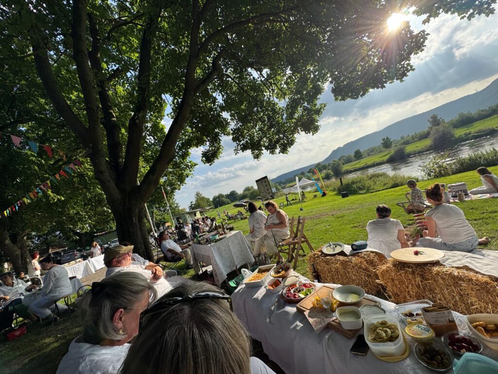 Der Verein Boffzen Aktiv e. V. griff die Anregung begeistert auf und verwandelte das Weserufer in eine charmante Freilufttafel: Bierzeltgarnituren und Holzbänke wurden aufgestellt, wer es rustikaler mochte, nahm auf Heuballen Platz oder breitete eine weiße Decke direkt am Wasser aus.