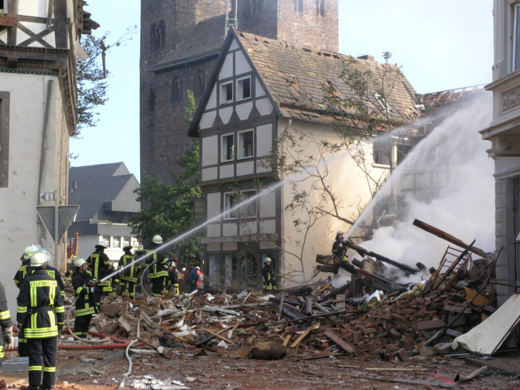 Der Kreis Höxter rief noch am selben Tag den Katastrophenfall aus. Fast 300 Helferinnen und Helfer waren im Einsatz, insgesamt 400 Rettungskräfte kämpften gegen Flammen, Schutt und Einsturzgefahr. Rund 400 Tonnen Trümmer wurden abgetragen. Trümmerteile flogen bis auf den Marktplatz.