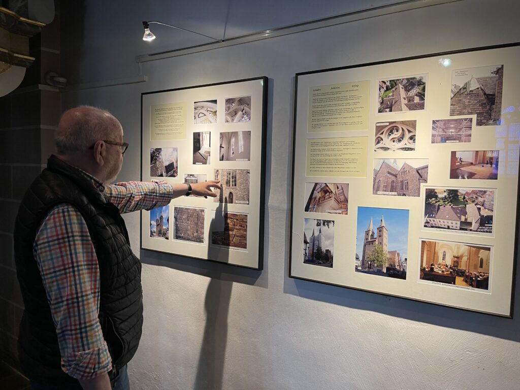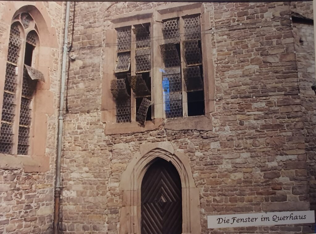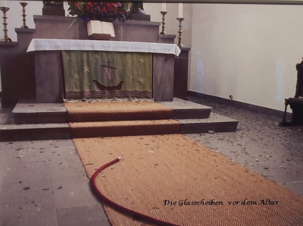 Im Inneren zeigt er auf Fotos an der Wand: zerstörte Bleiglasfenster, Mauerrisse, herabgestürztes Gestühl. „Hier, schauen Sie“, sagt er, und deutet von Bild zu Bild. Zu jedem weiß er eine Geschichte: wie Fenster ins Kircheninnere geschleudert wurden, wie neue Risse die Mauern durchzogen oder wie die erst kurz zuvor restaurierte Orgel wieder ausgebaut werden musste. Die Schäden an der Kirche beliefen sich auf rund 1,3 Millionen Euro.