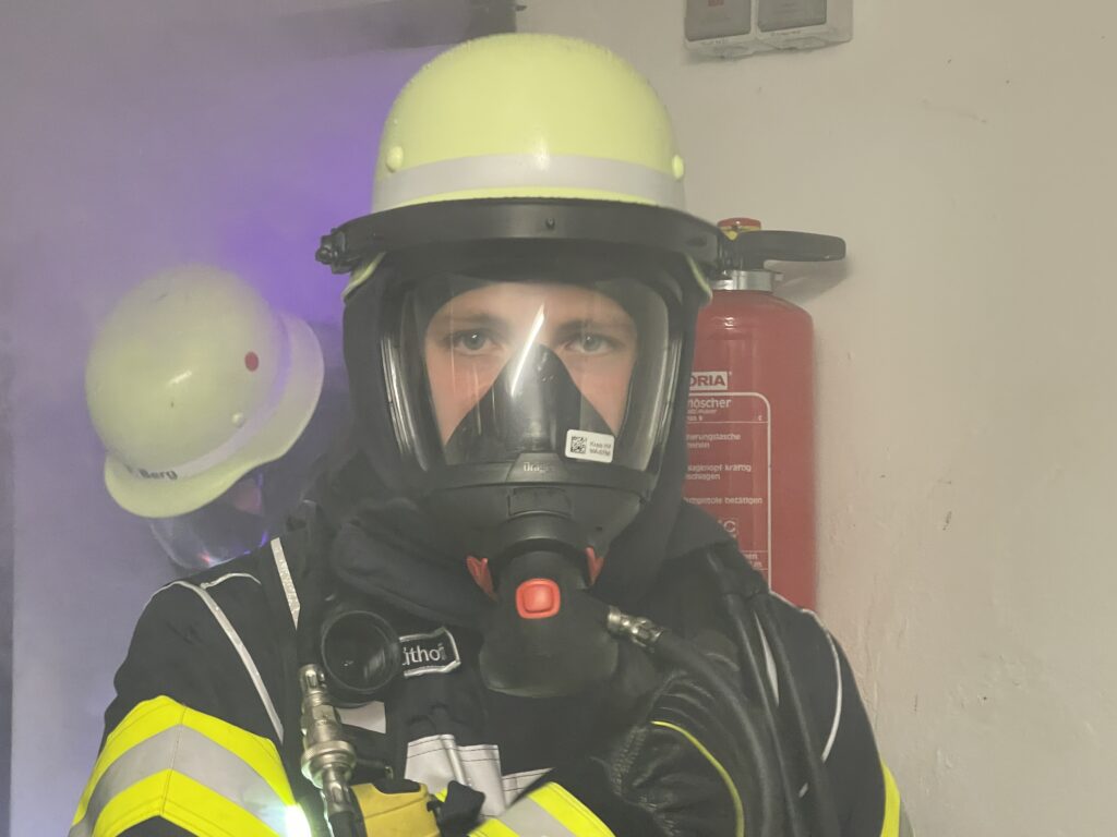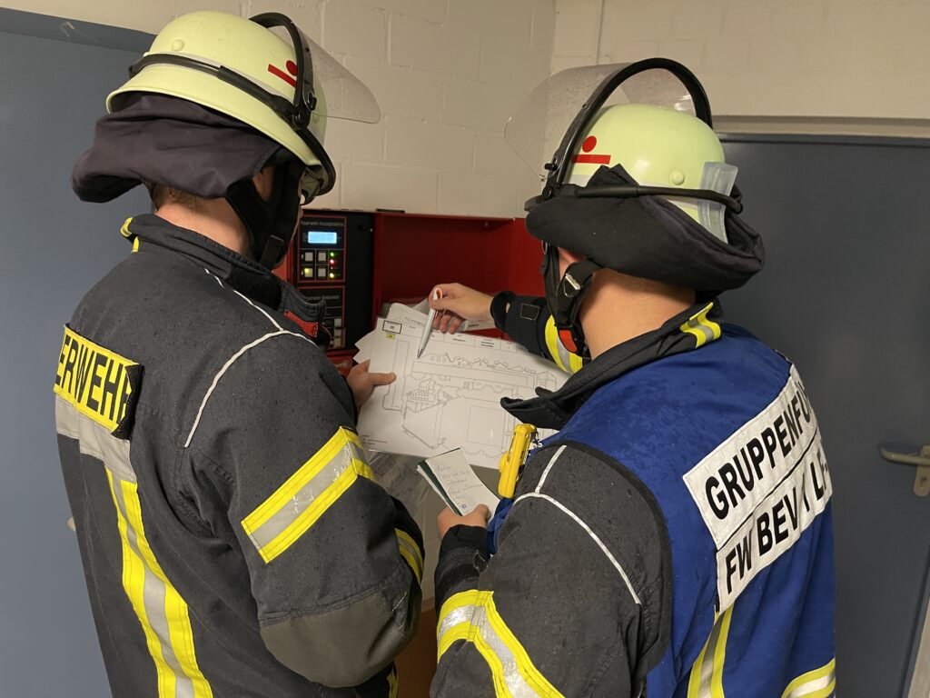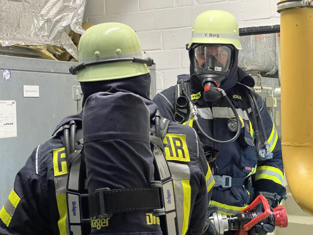Kaum war diese Lage gemeistert, folgte der nächste Alarm: In der Stadthalle Beverungen hatte eine Brandmeldeanlage ausgelöst. Dichter Rauch drang aus dem Technikraum im Keller. Mit Atemschutz kämpften sich die Feuerwehrleute durch verqualmte Gänge und bekämpften das Feuer. „Hier war Teamarbeit gefragt, denn die Orientierung in unbekannten Räumen ist im Einsatz oft die größte Herausforderung“, erklärte Brandoberinspektor Sebastian Hundt, der gemeinsam mit Gemeindebrandmeister Philipp Pedall unterstützte.