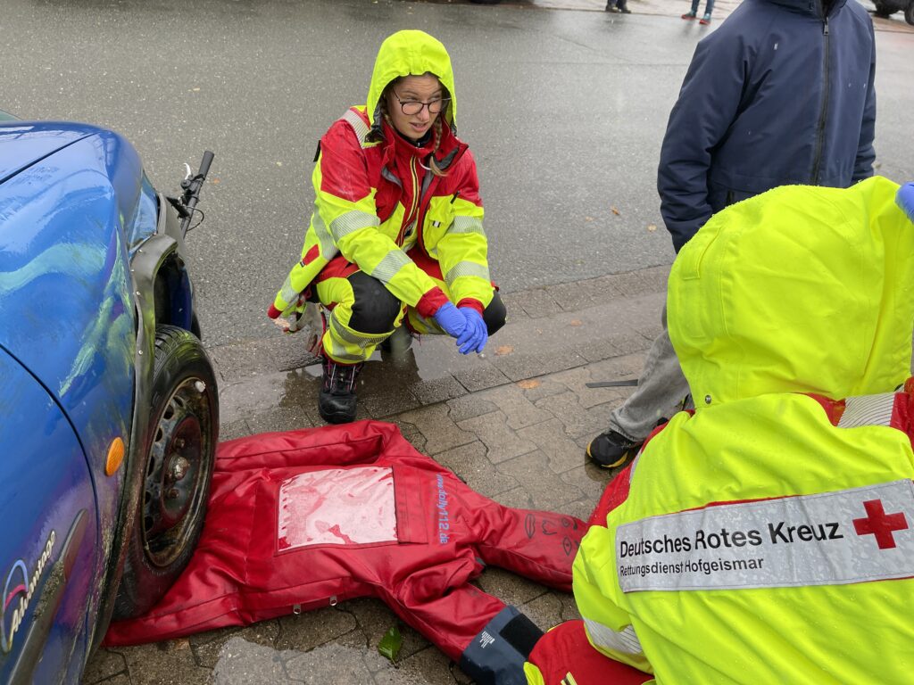 Gleich zu Beginn mussten die gemischten Trupps, zusammengesetzt aus Mitgliedern aller Wehren, bei einem Verkehrsunfall ihr Können zeigen. In der Industriestraße war ein Kind unter einem Pkw eingeklemmt – glücklicherweise nur in der Übung. Die siebenjährige Jonatan und der zehnjährige Leonhard spielten ihre Rollen als Verunglückter und Zeuge so überzeugend, dass selbst erfahrene Sanitäter des Roten Kreuzes ins Schwitzen gerieten. Da auf den Fahrzeugen keine hydraulischen Rettungsgeräte verlastet waren, mussten die Einsatzkräfte improvisieren – eine realitätsnahe Herausforderung.